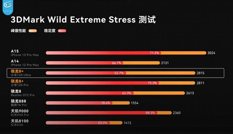 Во-первых с помощью тестового пакета 3DMark Wildlife были измерены производительность процессорных ядер и графического контроллера — здесь Xiaomi 12S Pro и Xiaomi 12S Ultra с процессором Snapdragon 8+ Gen 1 уступили iPhone 13 Pro Max с чипом Apple A15 Bionic на борту, но оказались мощнее всех Android-устройств на различных платформах, включая далеко не слабую SoC MediaTek Dimensity 9000.