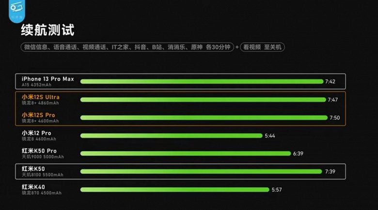 При этом в тестах на автономность SoT, которые представляют собой симуляцию реальной работы смартфона (Genshin Impact + мессенджер WeChat + голосовые и видеозвонки + интернет-серфинг + TikTok и потоковые видеосервисы), модели Xiaomi 12S Pro и Xiaomi 12S Ultra заняли верхние строчки, правда, лишь немного опередив в этом плане старый-добрый Redmi K50 и всё тот же iPhone 13 Pro Max.