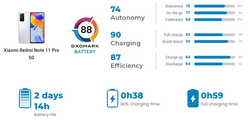 В итоге в DxOMark отметили, что при умеренном использовании владельцы Redmi Note 11 Pro могут рассчитывать на 2,5 дня его автономной работы. При этом в экономном режиме, 4 часа в день, смартфон продержится 62 часа, а при интенсивном использовании, 7 часов в день, он сможет проработать 32 часа.